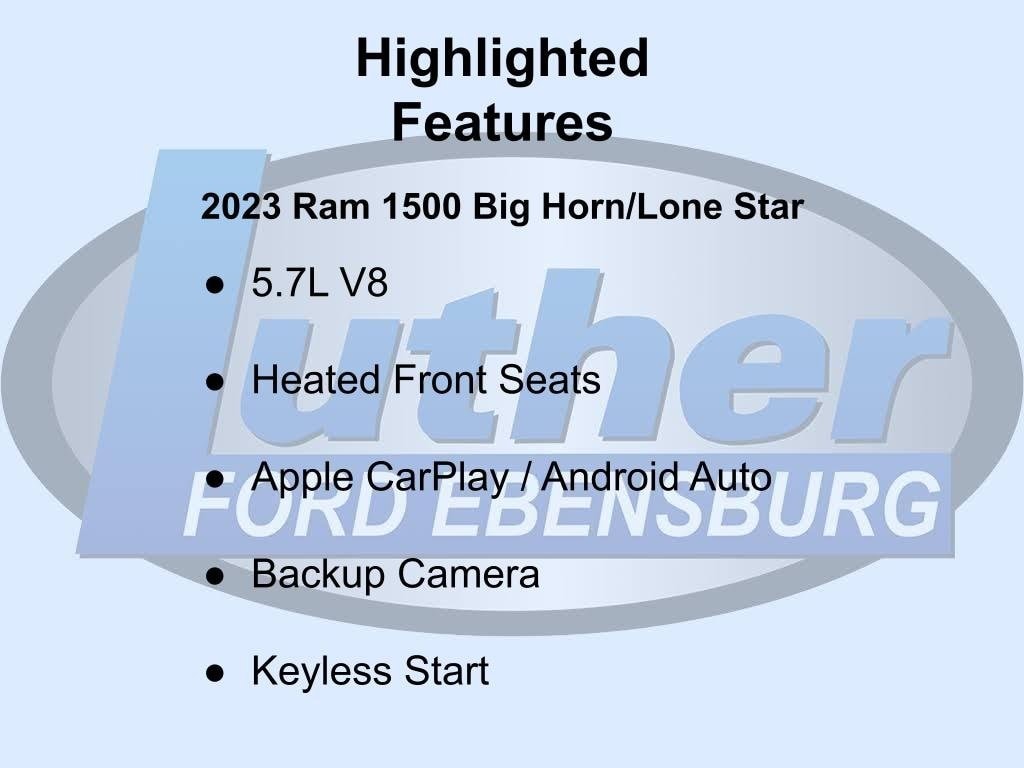 Crew Cab 4x4 -- Trailer Tow Group -- Big Horn -- 5.7L V8 -- Recent Arrival! Thank you for choosing Luther Ford Ebensburg. This stunning 2023 Ram 1500 has recently been added to our inventory and is currently being reconditioned by our expert team of specialists. Please feel free to reach out for any information you need.